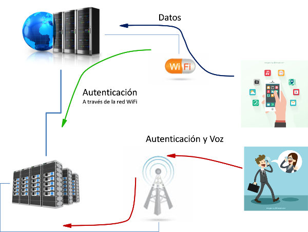 Esquema de conexión entre operadores móviles y Wi-Fi y flujo de información de usuario (algunos gráficos han sido tomados de Freepik)